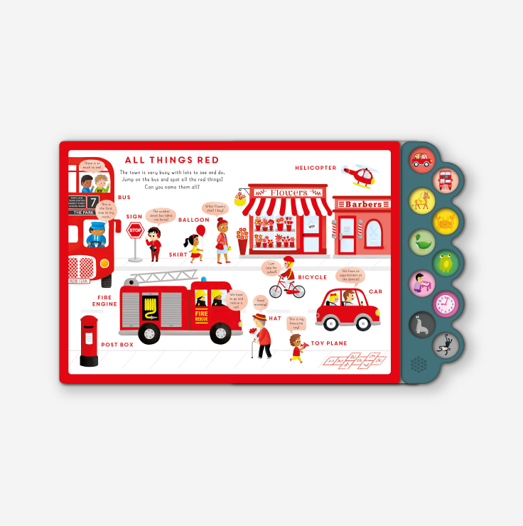 A lovely engaging sound book, the perfect way to introduce your child to colours. Fun bright illustrations introducing colours and everyday words. Interactive sound buttons relating to each spread. Illustrated by Fiona Barden. CURRENTLY OUT OF STOCK Series Look, Listen and Learn Extent 12pp + sound bar + cover TPS 240mm x 285mm x 20mm ISBN 978-1-78468-224-8