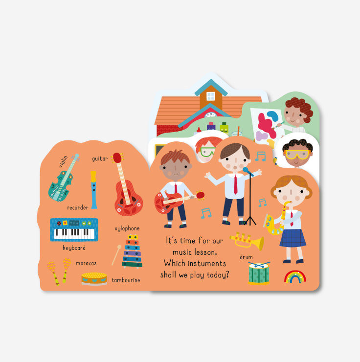 - Clever die-cut pages, with later spreads partially hidden to reveal.