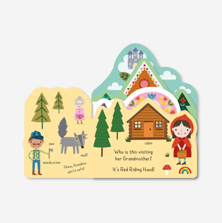 - Clever die-cut pages, with later spreads partially hidden to reveal.